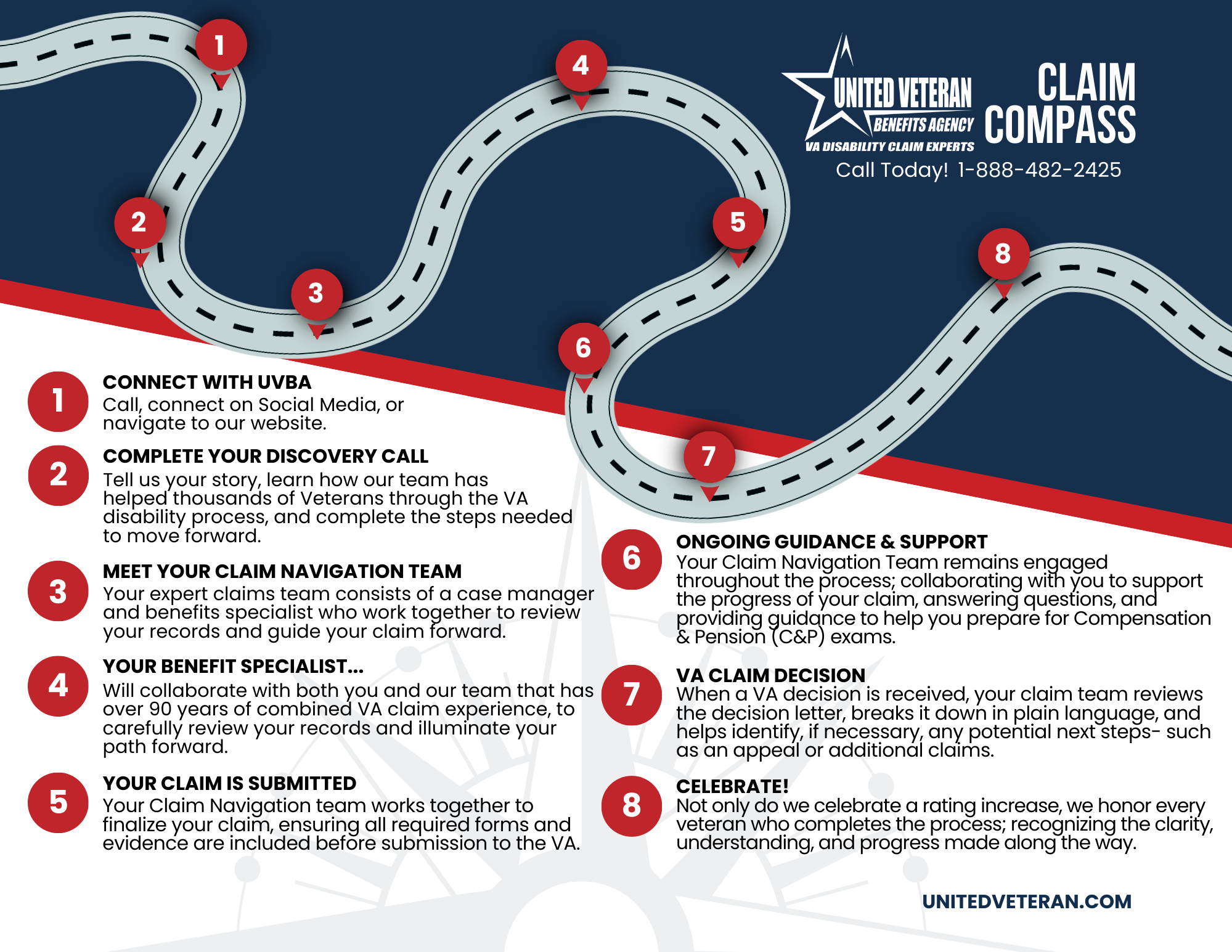 The Claim Compass is a clear, visual roadmap designed to help Veterans understand the VA disability process from start to finish. More importantly, it reflects our commitment to transparency, education, and guidance — because Veterans deserve to understand the journey, not just the destination.